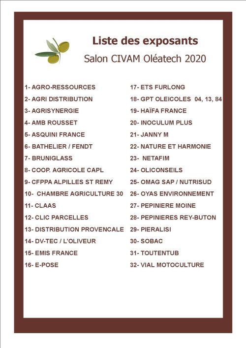 OLEATECH où la vulgarisation de l’information et de la technique culturale de l’olivier : c’est toujours une trentaine d’exposants professionnels + 6 conférences de techniciens spécialisés du monde oléicole avec démonstrations de récolte en verger sur 2 journées !