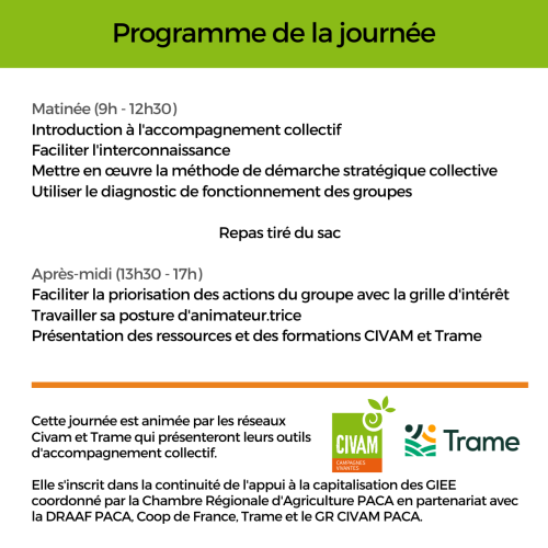 Le GR CIVAM PACA et Trame organise cette journée le jeudi 22 janvier 2026 de 9h à 17h à Aix-en-Provence pour les animateur.trices, conseiller.ères accompagnant des groupes d’agriculteur.trices (GIEE, Dephy, 30 000 et autres).